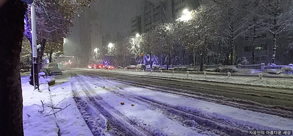 전날 저녁 7시를 기해 대설주의보가 발효되더니, 그 시각을 즈음해 정말로 눈이 내리기 시작했다. 올 겨울 들어 첫눈인 셈이다. 어릴 때 맞이하던 눈은 아이들의 기분을 마냥 들뜨게 했지만, 나이들어 맞이하는 눈은 '내일 어떻게 출근하지?'라는 생각부터 앞선다. 작년에도 그랬지만, 올해 역시 첫눈 시점이 무척 이르다. 그것도 시늉만이 아닌 제법 많은 양이 내렸다.